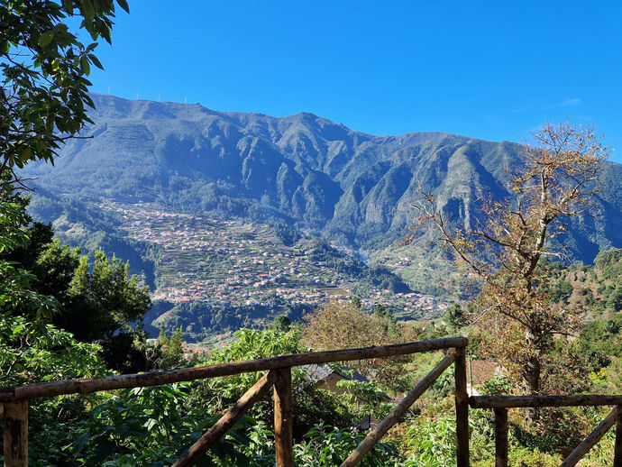 If you want a walk with astonishing scenery from multiple viewpoints and spectacular Waterfalls, then this is the one for you. We walked it in December, during an unexpectedly warm and sunny week. Rising from Rosario on the twisty steep Ribiera Brava old road, we took the right fork at Encumaeda, passing through a couple of old road tunnels before arriving at a viewpoint on the left. Here, we were high above the Serra de Água valley with views across to the high peaks and dow