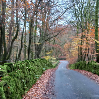 I followed the road along Padiham Heights crunching along a path carpeted with autumn leaves and walking beside a drystone wall blanketed with a thick coat of green moss , crossing at the crossroads and entering Black Hill Woods.